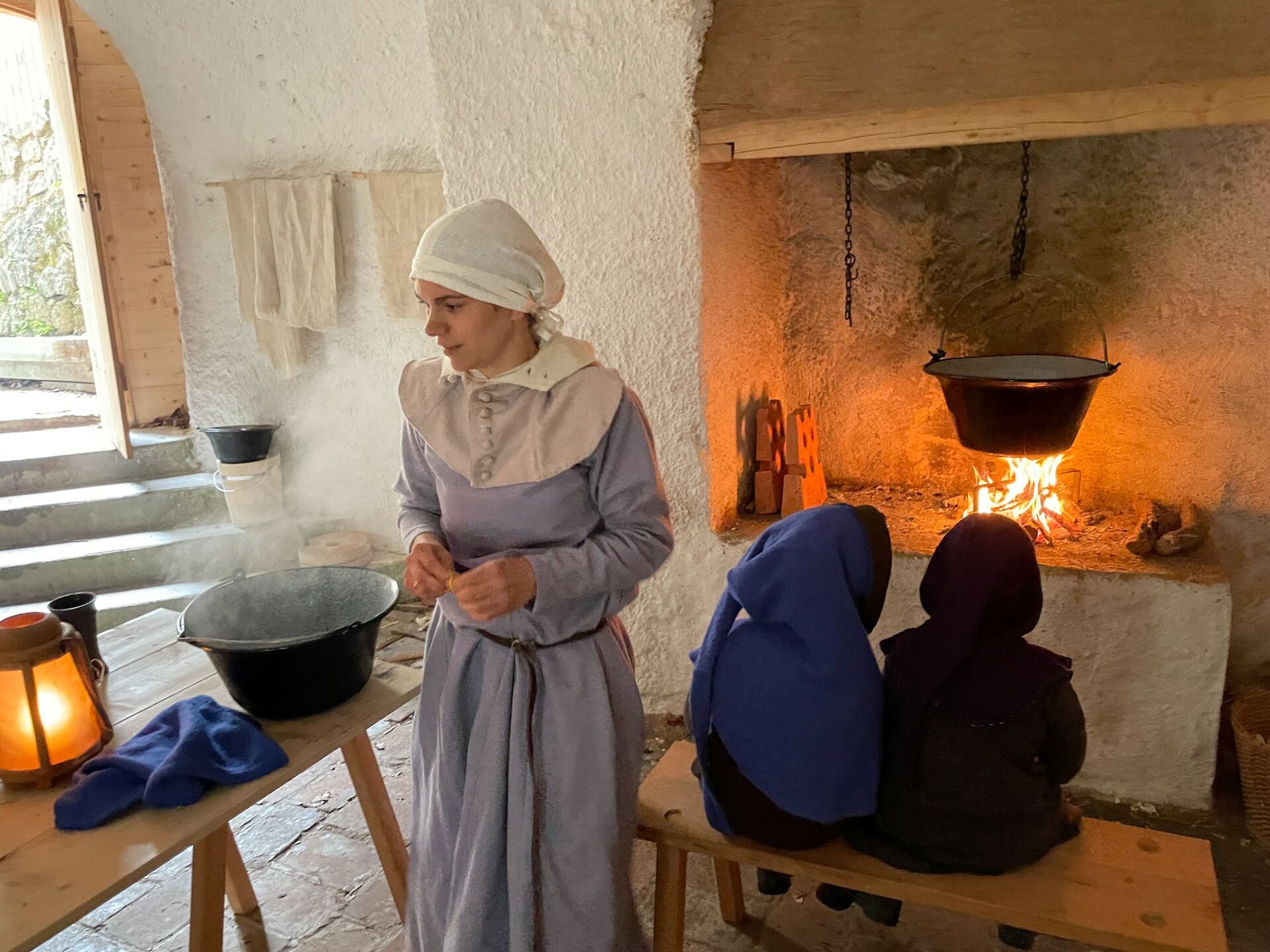 Es wird geschneidert, geschustert, getischlert und gemalt. Natürlich wird auch gekocht wie in der Spätgotik. Hierbei wird akribisch darauf geachtet, dass die Zutaten und Rezepte der damaligen Zeit entsprechen. Wenn der Rauch aus dem mit Haselnusszweigen geflochtenen und Lehm verputzen Rauchabzug der historischen Küche aufsteigt, nebenbei der Tisch mit Tongeschirr in der Stube gedeckt wird, dann ist das ein unvergesslicher Anblick für Groß und Klein.