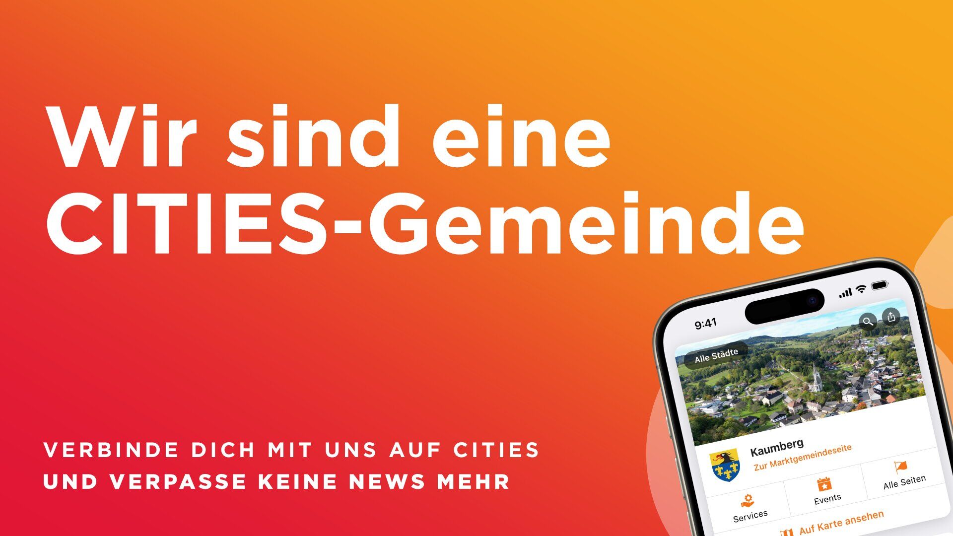 CITIES ist unsere neue digitale Plattform, die KAUMBERG verbindet und auf der Ihr alle Infos, News, Events und Services unserer Gemeinde findet. Wir möchten unseren Bürgerservice für euch so effizient und bequem wie möglich gestalten. Daher nutzen wir CITIES als zentrale Informationsplattform.