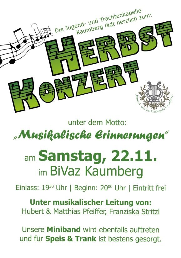 Musik weckt Erinnerungen – unter diesem Motto lädt die Jugend- und Trachtenkapelle Kaumberg herzlich zum traditionellen Herbstkonzert ein. Erleben Sie Momente, in denen Klänge, Melodien und Lieder Emotionen und Erinnerungen lebendig werden lassen.